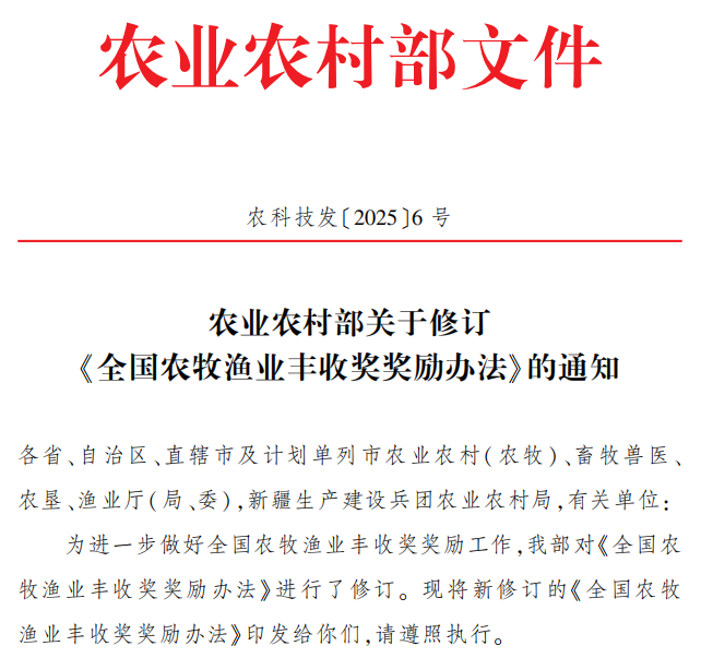 为做好全国农牧渔业丰收奖奖励 工 作 , 调动广大农 业科技人员的积极性和创造性 ,加快农业科技成果转化和应用 ,助 力农业农村现代化、乡村全面振兴和农业强国建设 , 根据《 中华人 民共和国农业技术推广法》和国家有关规定