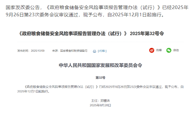 为规范承储政府粮食储备的企业或者其他组织政府粮食储备安全风险事项报告行为,推进健全内控管理制度,确保政府粮食储备安全